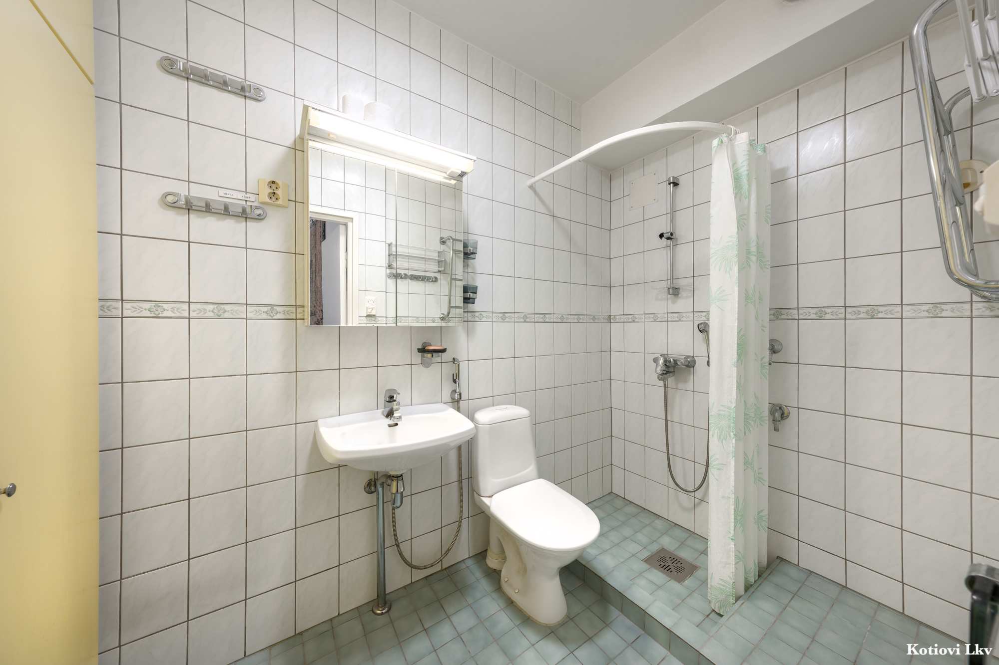 Kylpyhuoneen varusteet | Suihku, pesukoneliitäntä, lattialämmitys, peilikaappi, pesuallas ja suikuverho |