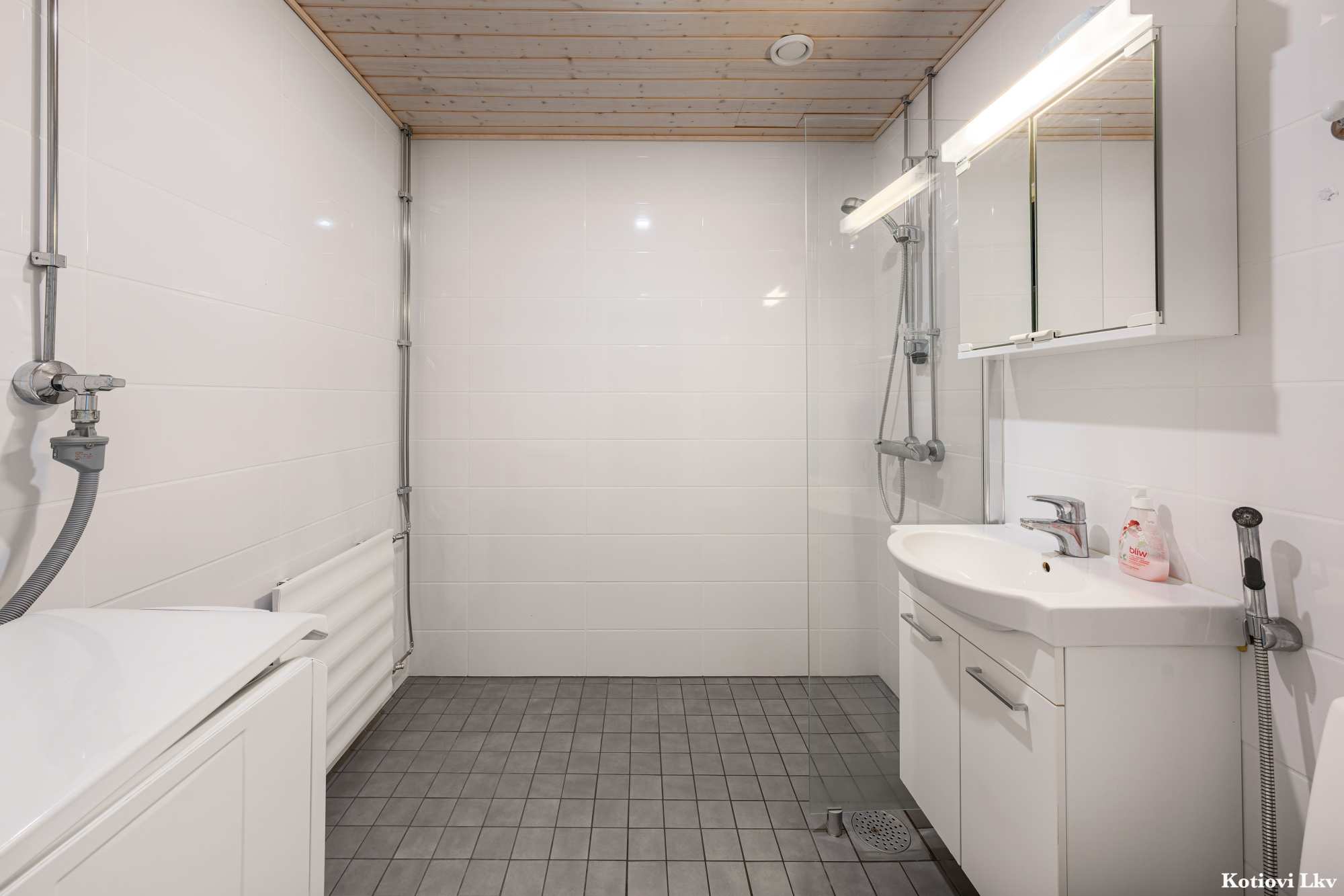Kylpyhuoneen varusteet | WC-istuin, suihku, suihkuseinä, peilikaappi, pesuallas, allaskaappi ja bidee-suihku |