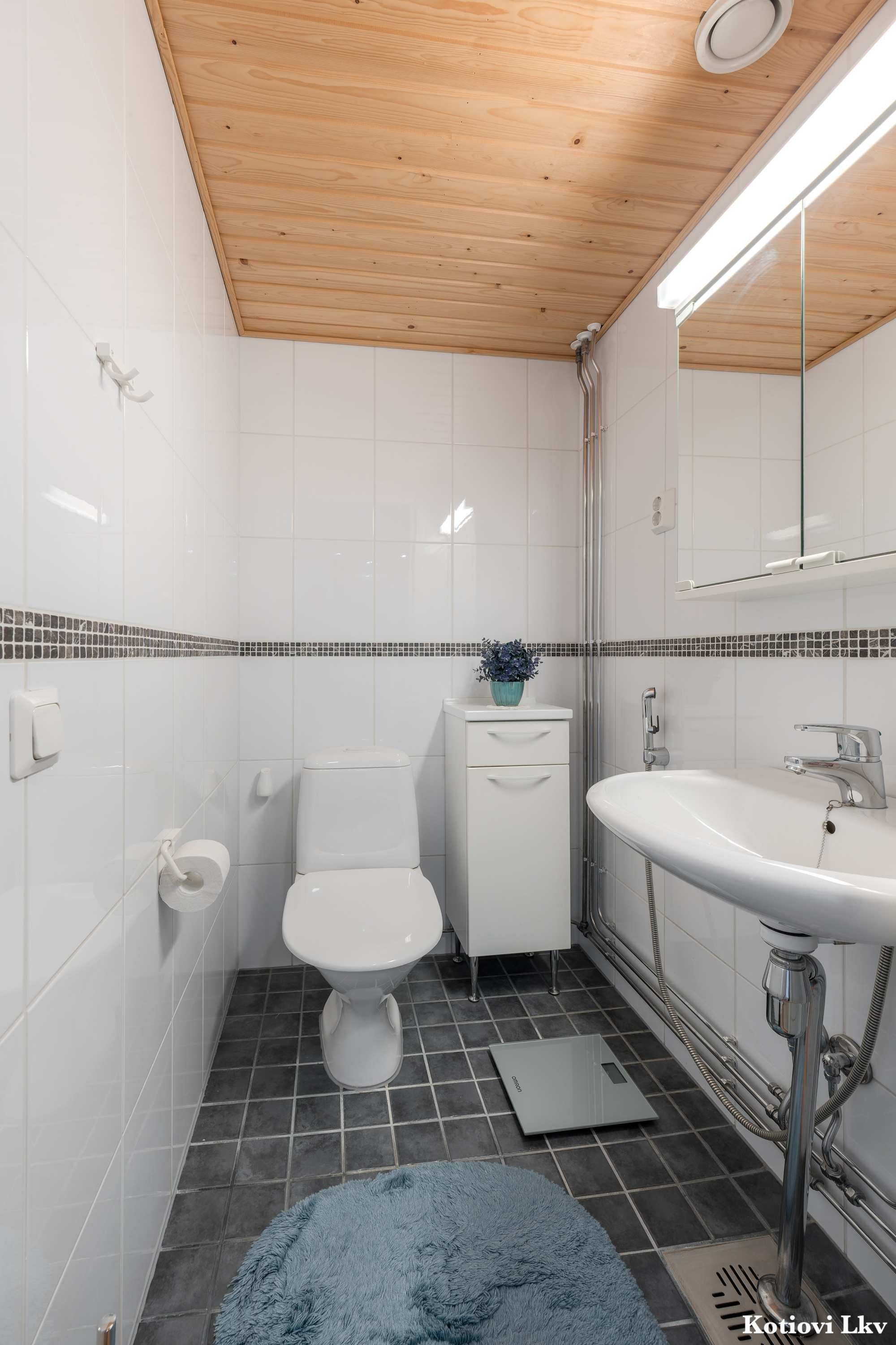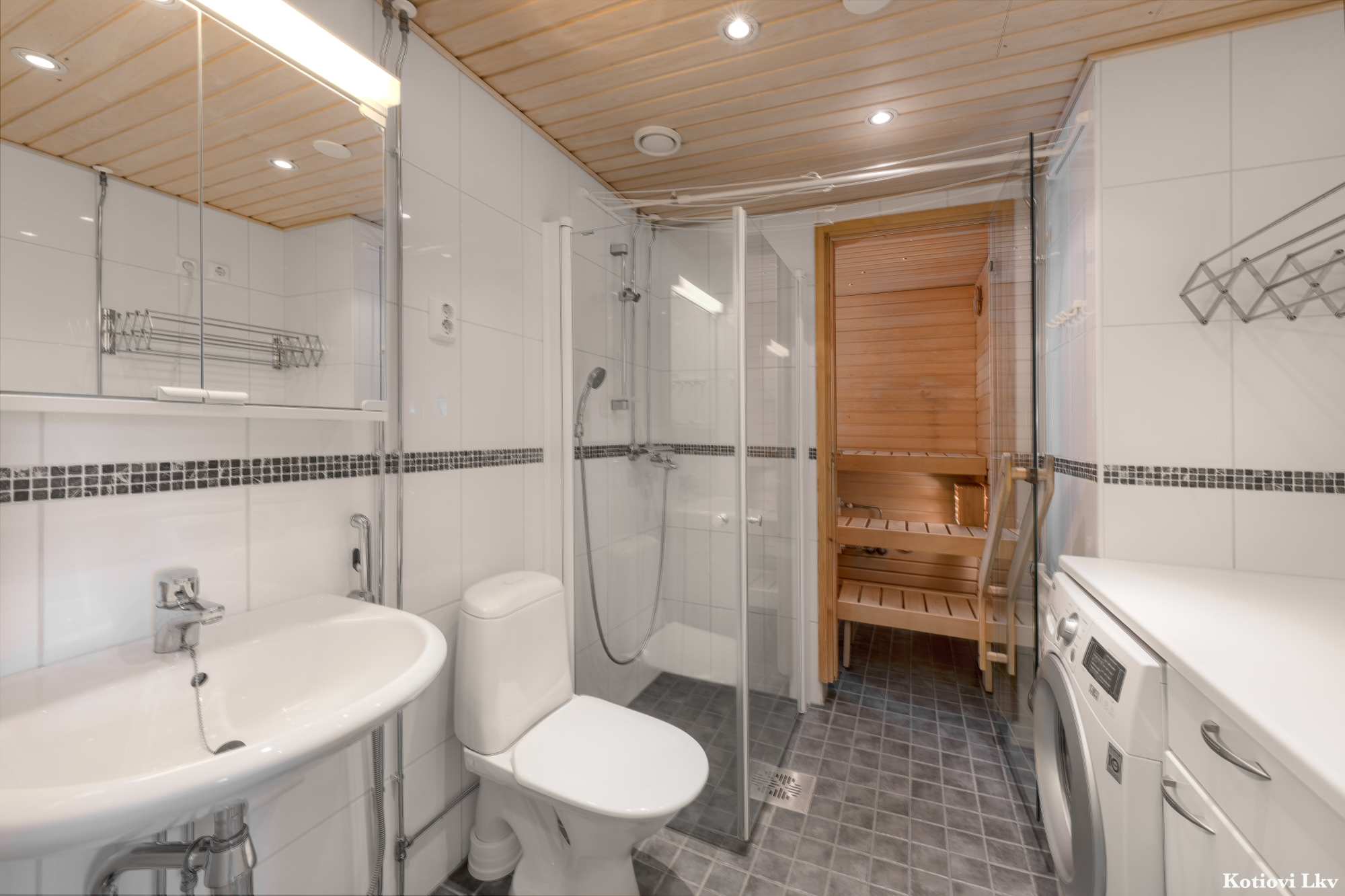 Kylpyhuoneen varusteet | WC-istuin, suihku, suihkuseinä, pesukoneliitäntä, lattialämmitys, peilikaappi, pesuallas, bidee-suihku ja kaapisto |