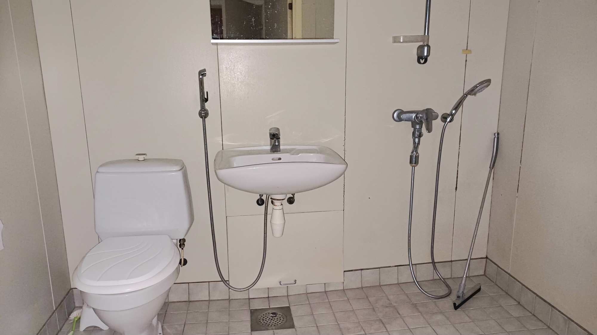 | Kylpyhuoneen materiaalit | Lattia: Muovimatto Seinät: muovipinnoitettu pelti |