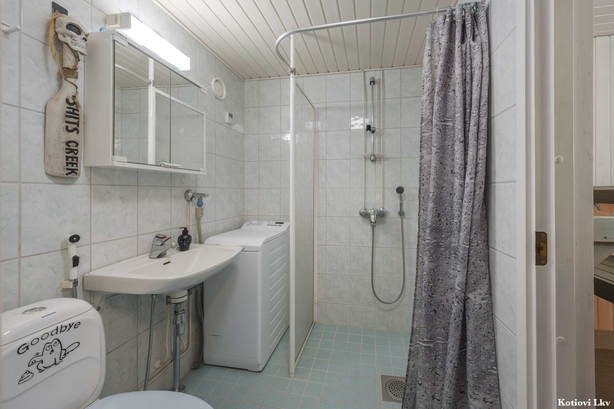 Kylpyhuoneen varusteet | WC-istuin, suihku, suihkuseinä, peilikaappi, pesuallas ja suihkuverhon kannatin |