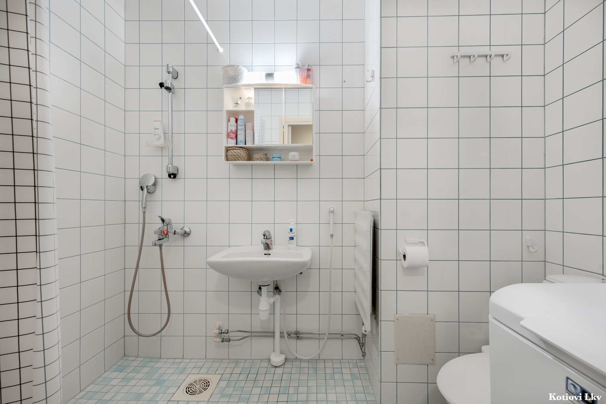 Kylpyhuoneen varusteet | WC-istuin, suihku, pesukoneliitäntä, peilikaappi, pesuallas ja bidee-suihku |