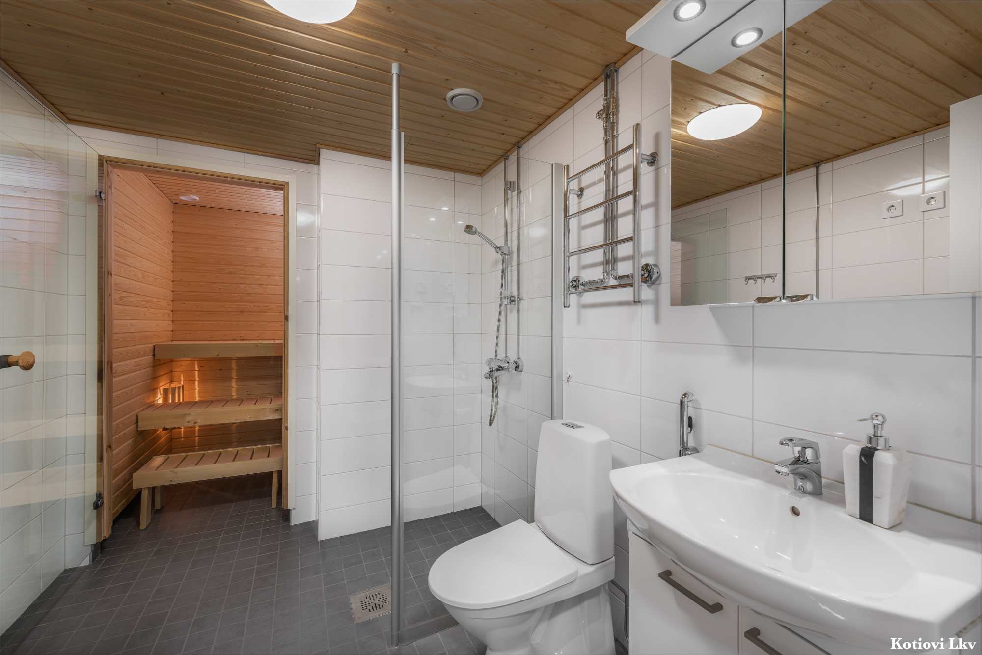Kylpyhuoneen varusteet | WC-istuin, suihku, suihkuseinä, pesukoneliitäntä, lattialämmitys, peilikaappi, pesuallas, allaskaappi ja bidee-suihku |