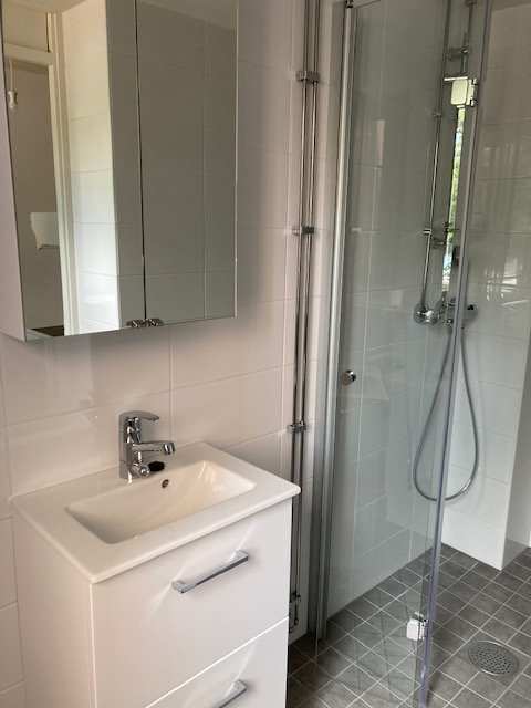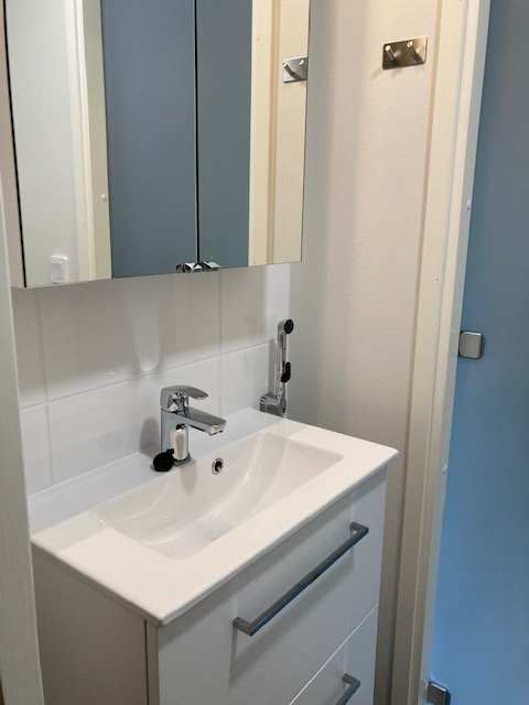 | Kylpyhuoneen varusteet | Suihku, suihkuseinä, pesukoneliitäntä, peilikaappi, pesuallas ja allaskaappi |