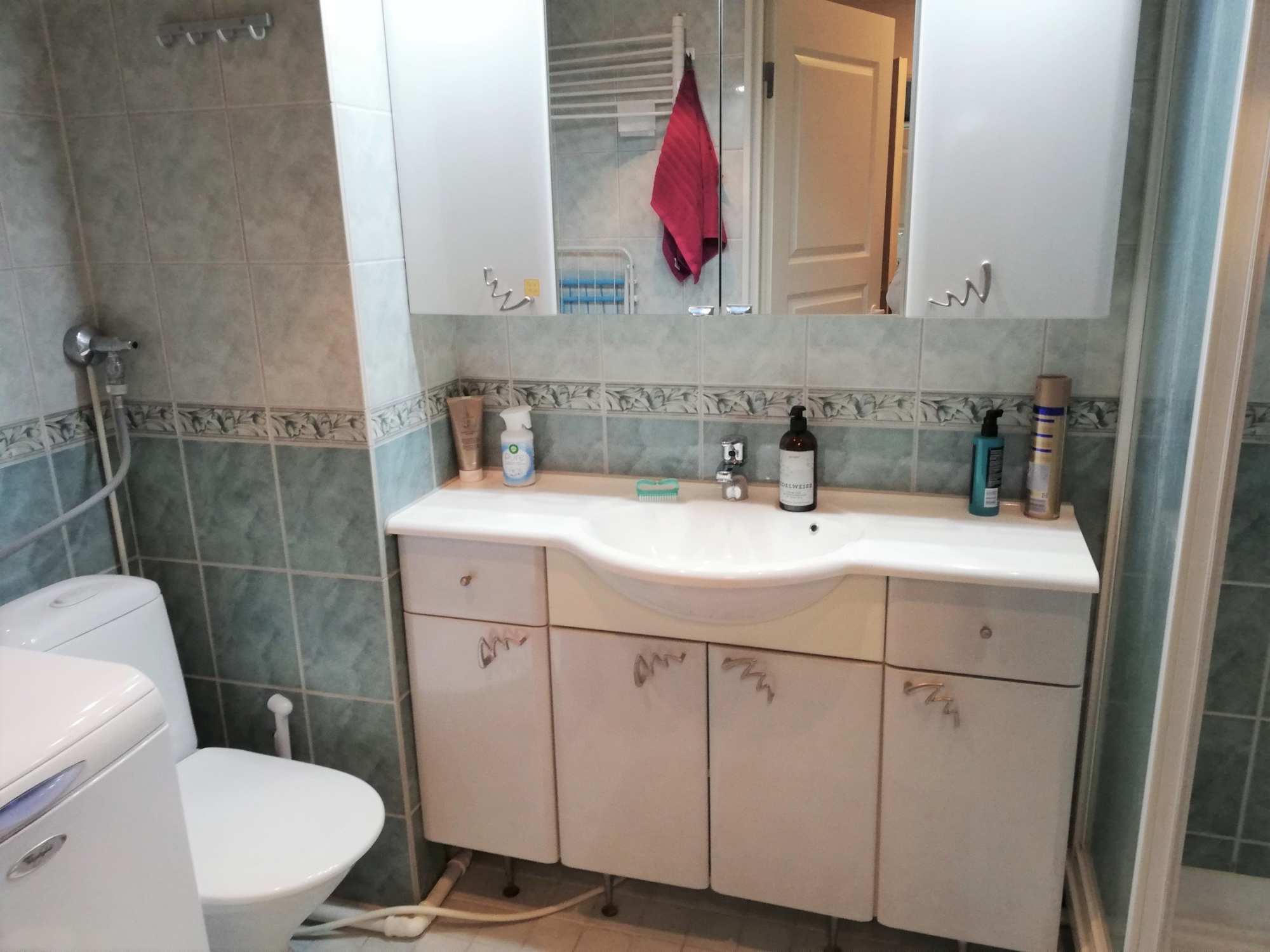 | Kylpyhuoneen varusteet | WC-istuin, suihku, suihkukaappi, peilikaappi, pesuallas, allaskaappi ja bidee-suihku |