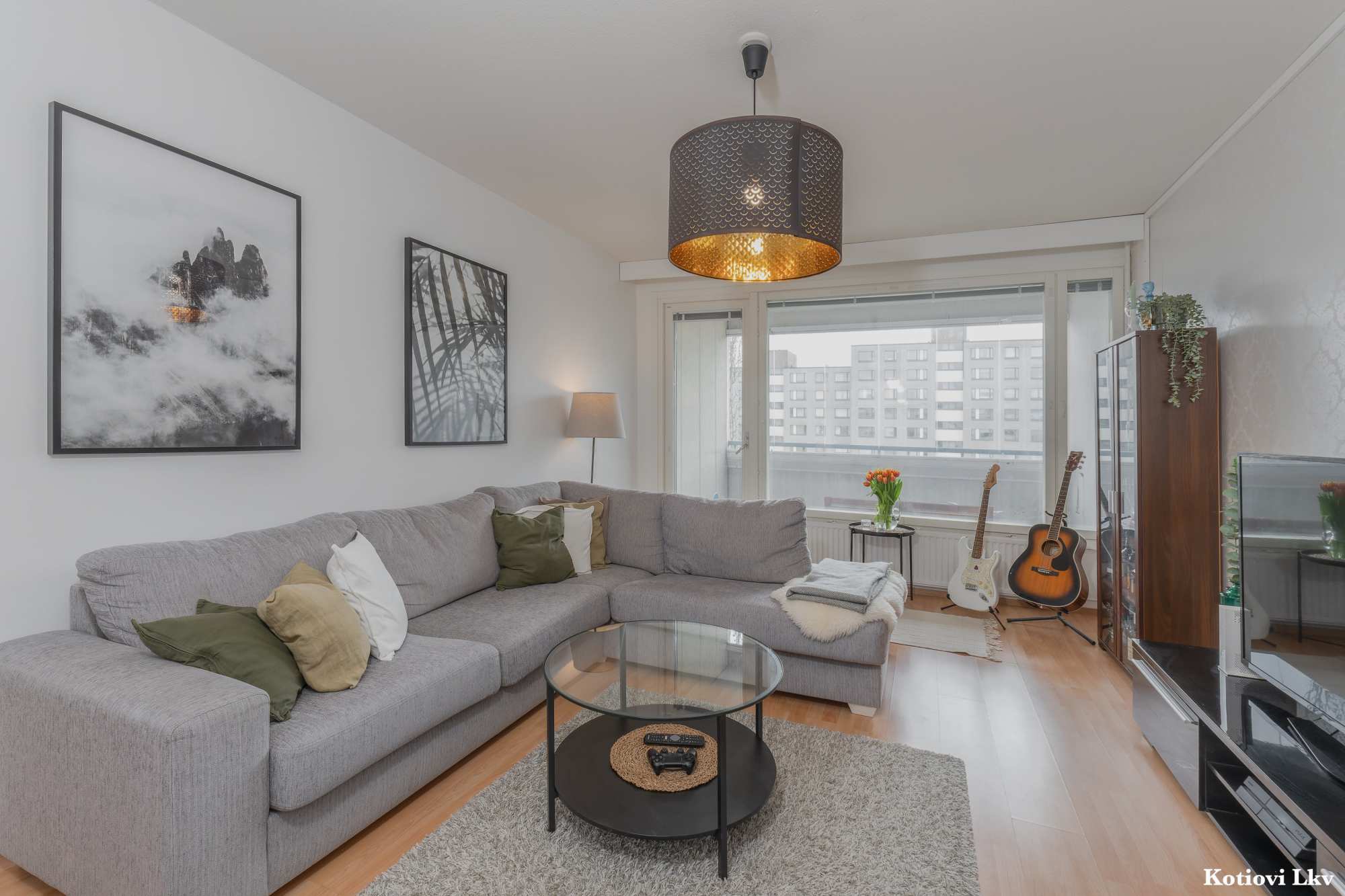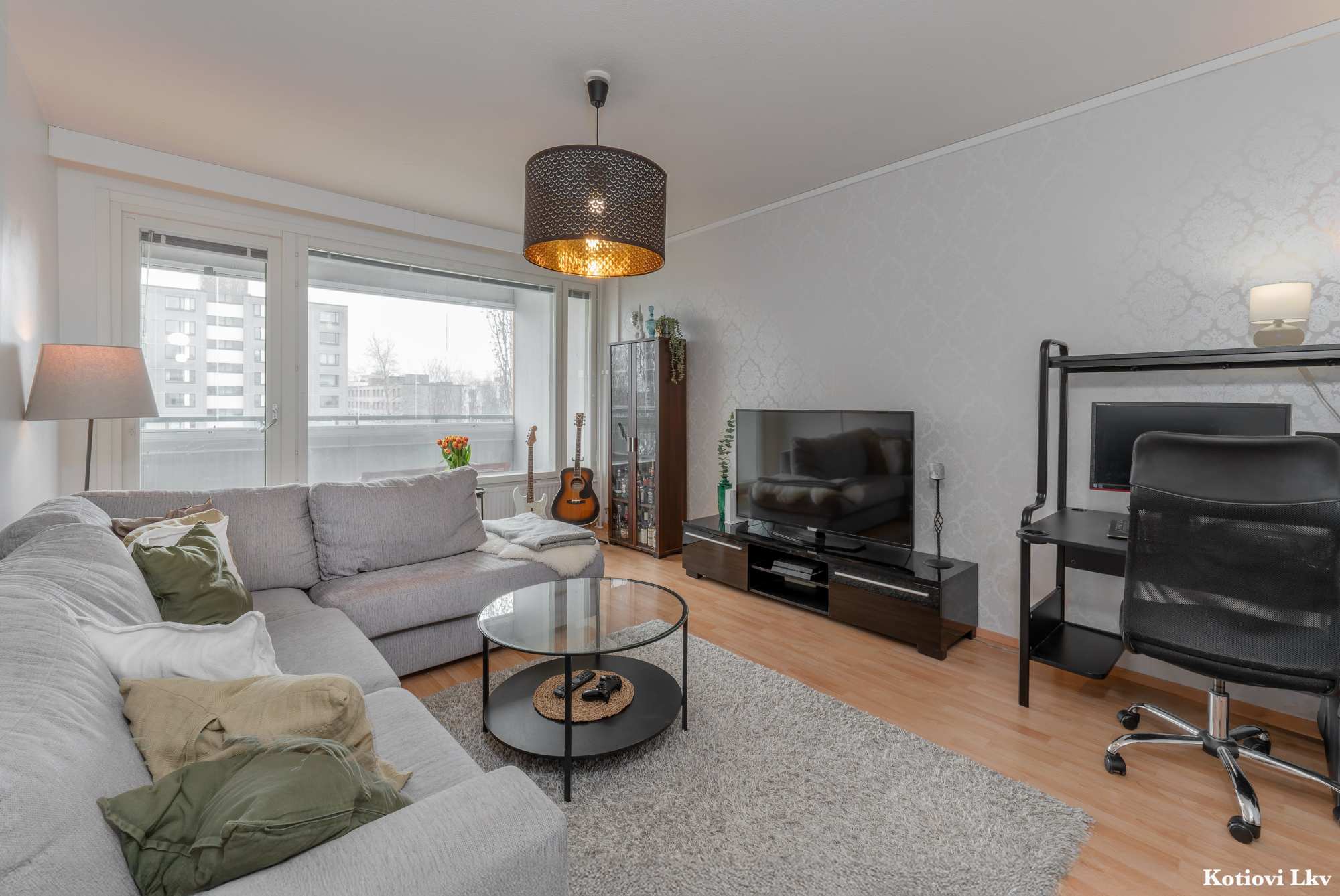 | Olohuoneen materiaalit | Lattia: Laminaatti Seinät: Maali ja tapetti |