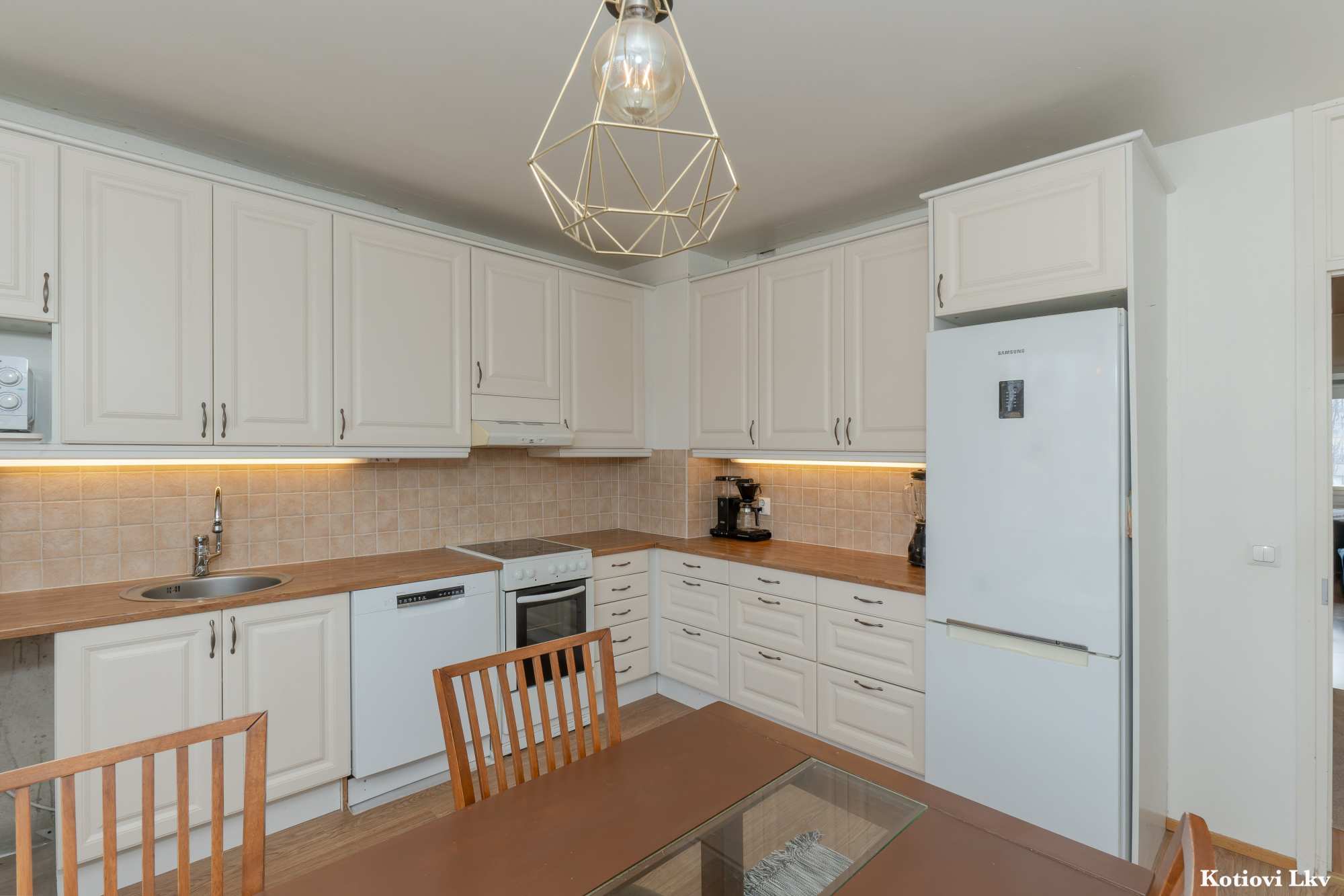 | Keittiön varusteet | Jääkaappipakastin, liesi, liesituuletin ja astianpesukone |
